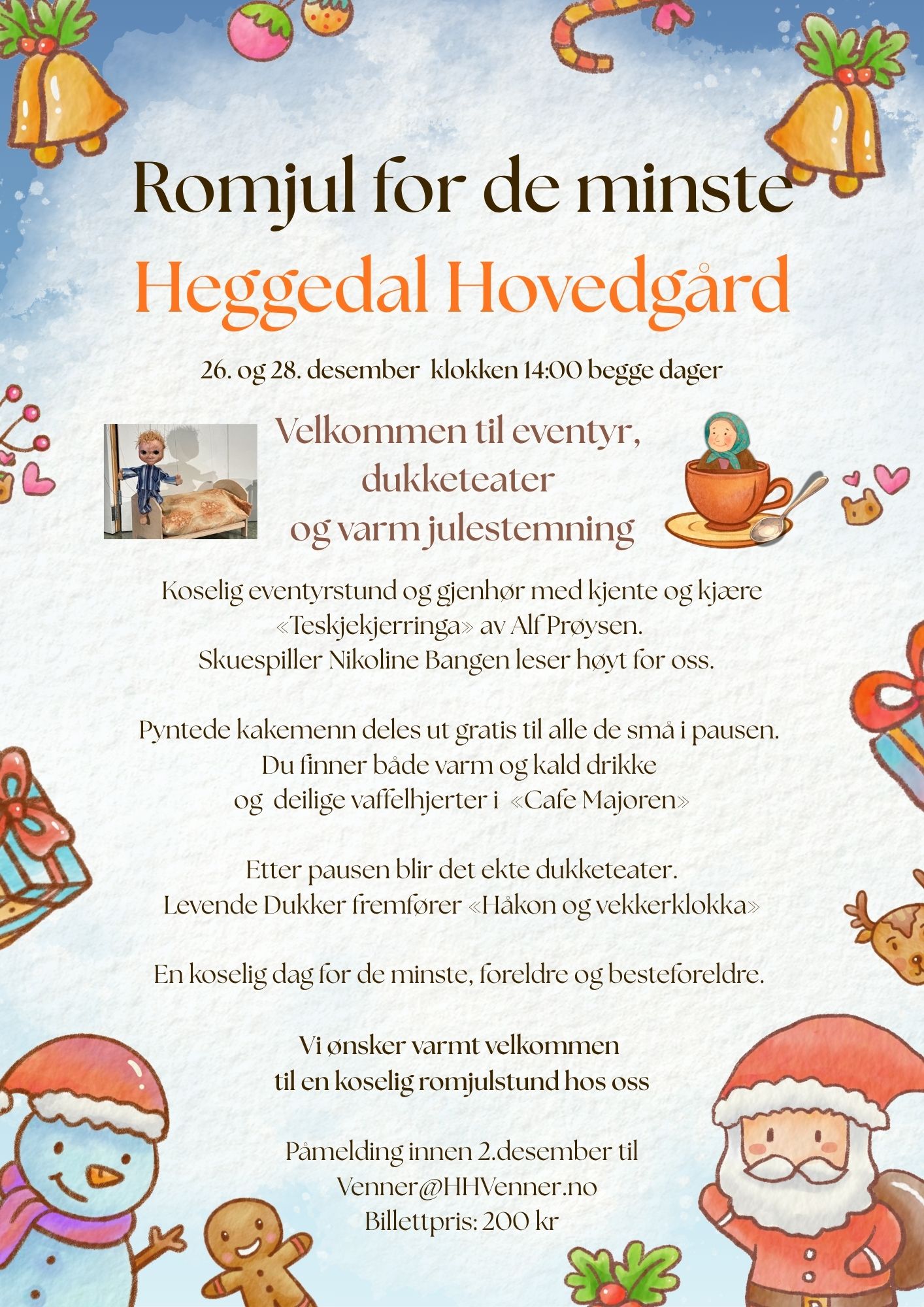 Eventyrstund + dukketeater for de minste. Eventyrstund ved Nikoline Bangen som leser «Teskjekjerringa» av Alf Prøysen + «Vekkerklokka» dukketeater ved Levende Dukker, som leier lagerplass på Låven. 200 kr pr barn målgruppe 2 – 5 år markedsføres gjennom alle barnehagene i Asker.