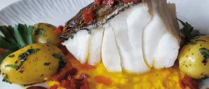 Torskemiddag med fersk fisk, lever og rogn og drikke
